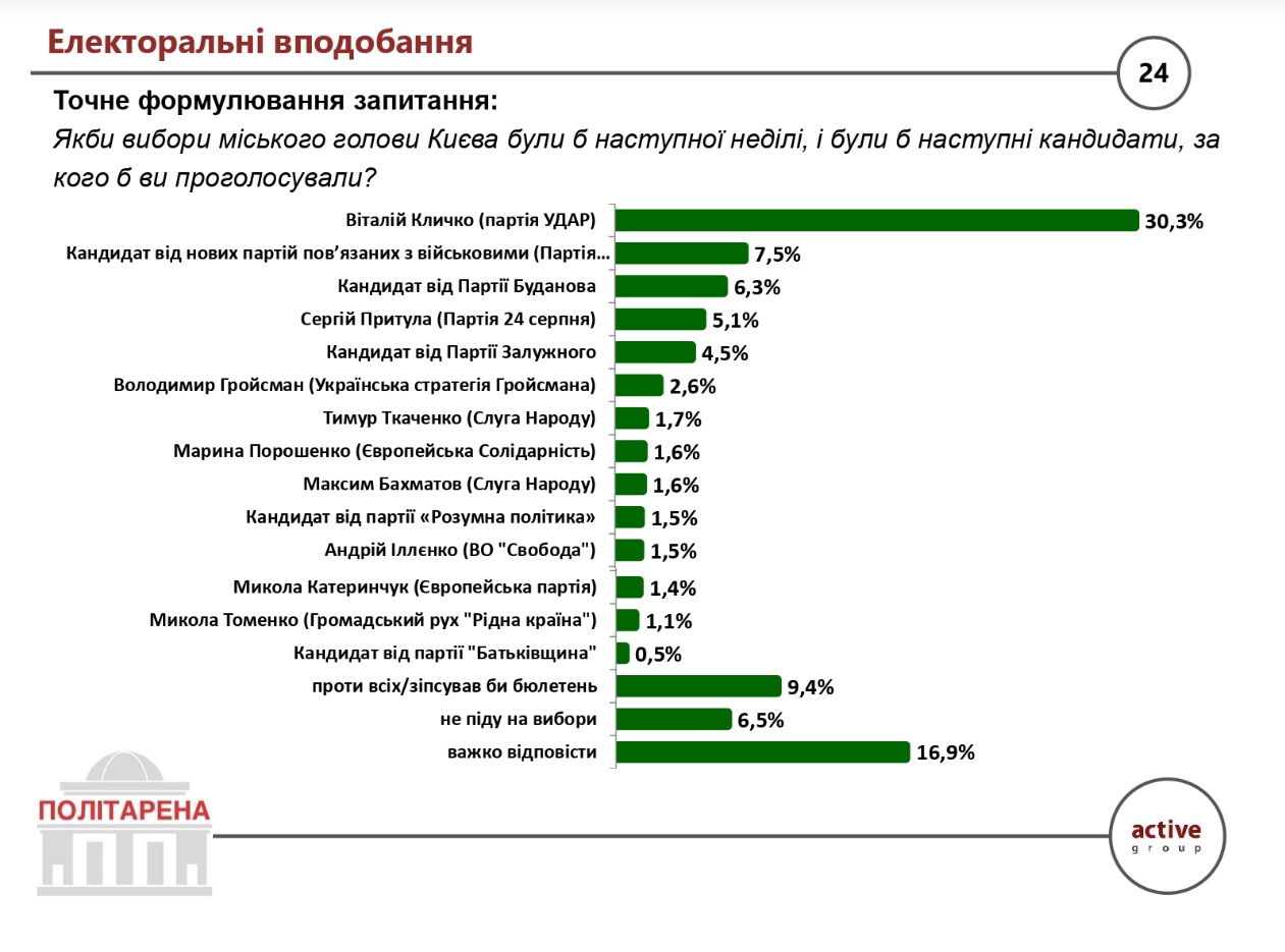 "Віталія Кличка готові підтримати 30,3% виборців – це найвищий показник серед усіх запропонованих кандидатів", - констатують в Active Group.