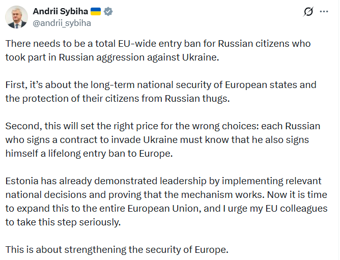 Міністр закордонних справ Андрій Сибіга закликав заборонити в'їзд до ЄС громадян РФ, які брали участь у війні проти України.