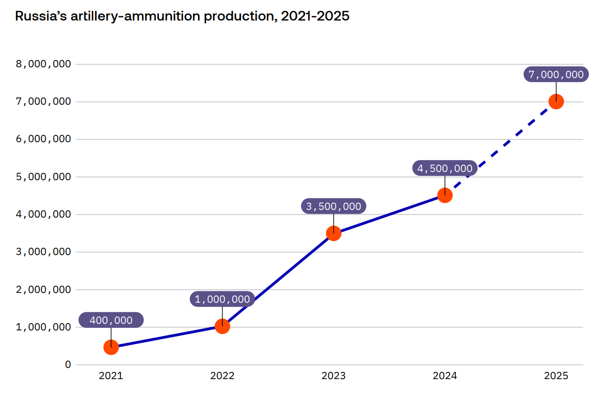 За оцінками естонської спецслужби, у 2025 році російські заводи виробили понад 7 мільйонів снарядів, мінометних мін і ракет, порівняно з 4,5 мільйона у 2024 році. Загалом від початку повномасштабного вторгнення в Україну виробництво боєприпасів у РФ зросло у 17 разів, переважно завдяки будівництву нових виробничих потужностей.