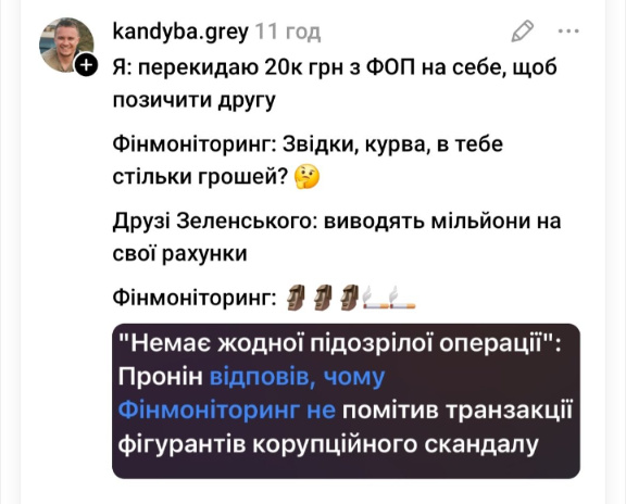 А от на питання ТСК, де взяли десятки мільйонів фірми-ніщєбродки, аби заплатити заставу за фігурантів Міндічгейту, Пронін увімкнув «дурачка якогось» і запевнив, що ніц не бачив. Жодного руху коштів, жодної підозрілої дії.