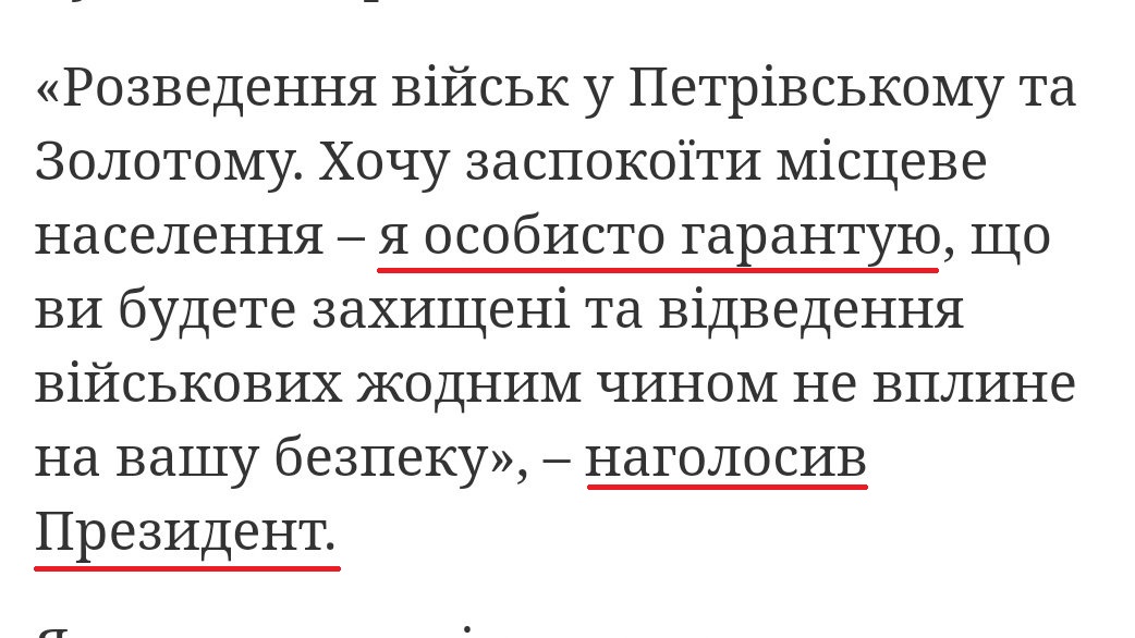 "Але якщо ми хочемо мати лінію контакту, яка не проходить через центр міст, то хтось повинен відступити. Якщо вони скажуть, що відступлять, а ми відступимо, це може спрацювати в районах, де, наприклад, є степ. А в містах, на мою думку, це не має сенсу. Якщо ми підемо, це буде мертва зона. Тому я вважаю це нелогічним. Щодо їхніх пропозицій про "вільну економічну зону" на Донбасі тощо, для нас це означає лише залишити нашу територію. Я не бачу в цьому справедливості. Це не правильно", - наголосив Зеленський.