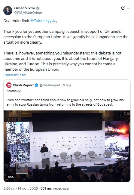 "Шановний Володимире Зеленський, дякую за чергову передвиборчу промову на підтримку вступу України до ЄС. Це дуже допоможе угорцям чіткіше побачити ситуацію. Однак є дещо, що ви неправильно розумієте: ці дебати не про мене і не про вас. Вони стосуються майбутнього Угорщини, України та Європи", – написав він.