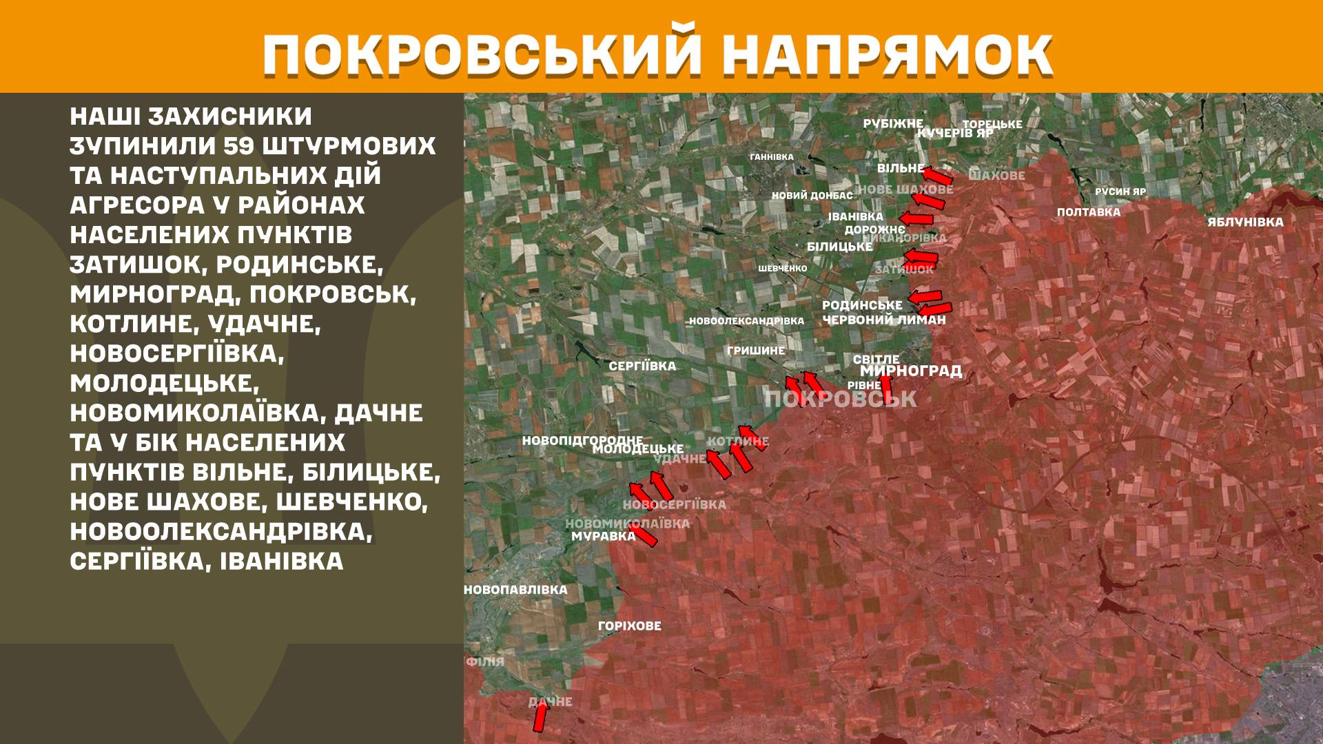 "На Покровському напрямку наші захисники зупинили 59 штурмових та наступальних дій агресора у районах населених пунктів Затишок, Родинське, Мирноград, Покровськ, Котлине, Удачне, Новосергіївка, Молодецьке, Новомиколаївка, Дачне та у бік населених пунктів Вільне, Білицьке, Нове Шахове, Шевченко, Новоолександрівка, Сергіївка, Іванівка", - йдеться у повідомленні.