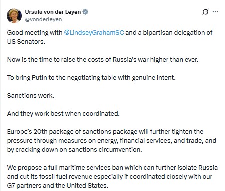 "20-й пакет європейських санкцій ще більше посилить тиск шляхом заходів щодо енергетики, фінансових послуг і торгівлі, а також шляхом припинення обходу санкцій. Ми пропонуємо повну заборону морських послуг, яка може ще більше ізолювати Росію та скоротити її доходи від викопного палива, особливо за умови тісної координації з нашими партнерами з G7 та Сполученими Штатами", - додала вона.