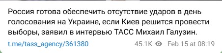 "Росія готова забезпечити відсутність ударів у день голосування в Україні, якщо Київ вирішить провести вибори", - заявив він.