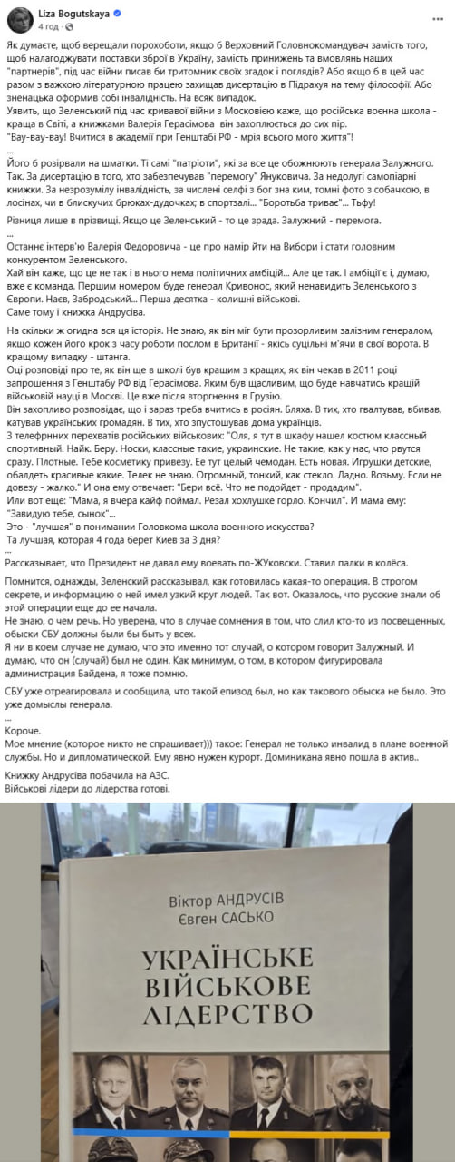 "Як думаєте, щоб верещали порохоботи, якщо б Верховний Головнокомандувач замість того, щоб налагоджувати поставки зброї в Україну, замість принижень та вмовлянь наших "партнерів", під час війни писав би тритомник своїх згадок і поглядів? Або якщо б в цей час разом з важкою літературною працею захищав дисертацію в Підрахуя на тему філософії. Або зненацька оформив собі інвалідність. На всяк випадок. Уявить, що Зеленський під час кривавої війни з Московією каже, що російська воєнна школа - краща в Світі, а книжками Валерія Герасімова він захоплюється до сих пір. "Вау-вау-вау! Вчитися в академії при Генштабі РФ - мрія всього мого життя"! Його б розірвали на шматки. Ті самі "патріоти", які за все це обожнюють генерала Залужного. Так. За дисертацію в того, хто забезпечував "перемогу" Януковича. За недолугі самопіарні книжки. За незрозумілу інвалідність, за числені селфі з бог зна ким, томні фото з собачкою, в лосінах, чи в блискучих брюках-дудочках; в спортзалі... "Боротьба триває"... Тьфу! Різниця лише в прізвищі. Якщо це Зеленський - то це зрада. Залужний - перемога", - написала депутатка.