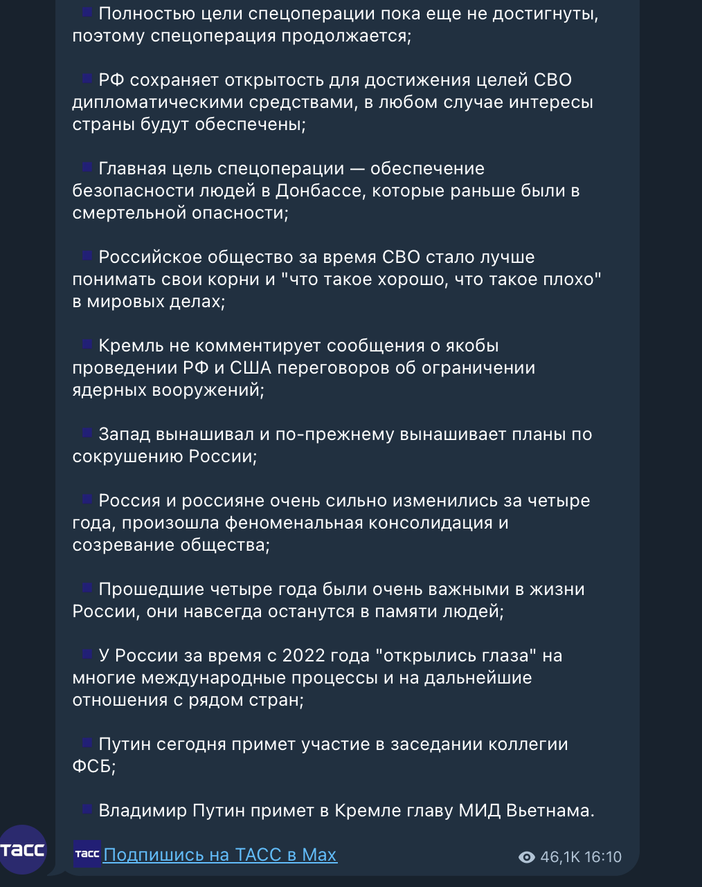 Як передає Цензор.НЕТ, заяву речника Путіна Дмитра Пєскова на четверту річницю повномасштабного вторгнення РФ в Україну цитують росЗМІ.