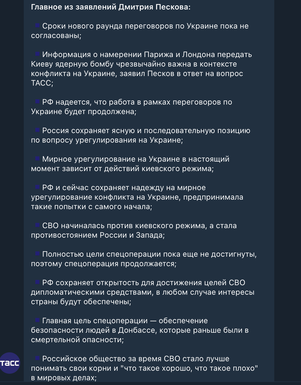 "Чи залишається ще надія, що конфлікт (війну РФ проти України, – ред.) можна буде завершити переговорами? Ця надія не покидала нас з самого початку… Наша позиція добре зрозуміла, послідовна. Зараз все залежить від дій київського режиму. СВО починалася проти київського режиму, а стала протистоянням Росії та Заходу. Захід виношував і, як і раніше, виношує плани щодо розгрому Росії", - додав речник Кремля.