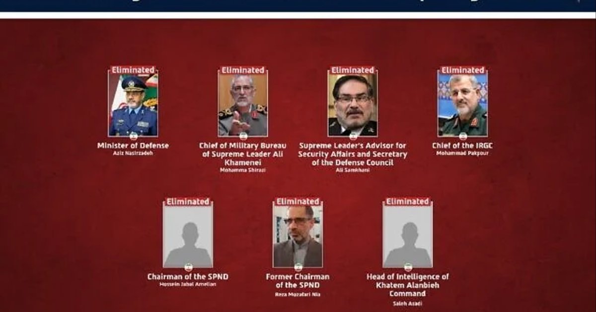 - Мохаммад Пакпур, командувач КВІР. ЦАХАЛ заявляє, що Пакпур очолював "план Ірану щодо знищення Ізраїлю" і був відповідальним за ракетні та дронові атаки на Ізраїль, підтримував проіранські угруповання та "ефективно керував жорстоким придушенням іранських протестувальників під час внутрішніх протестів минулого місяця".