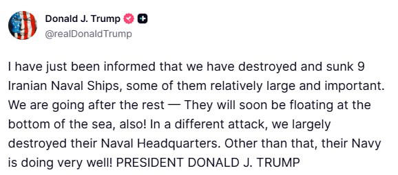 "Мені щойно повідомили, що ми знищили та потопили 9 іранських військово-морських кораблів, деякі з них були досить великими та важливими", - заявив президент США.