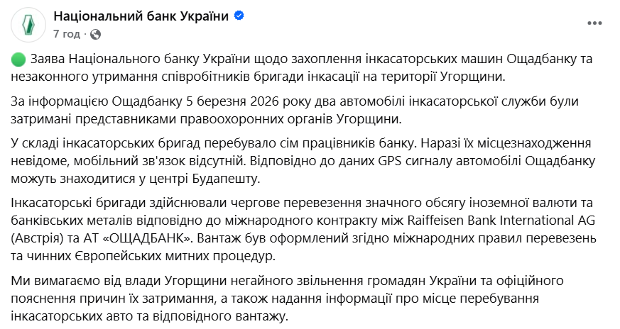 "За інформацією Ощадбанку 5 березня 2026 року два автомобілі інкасаторської служби були затримані представниками правоохоронних органів Угорщини.