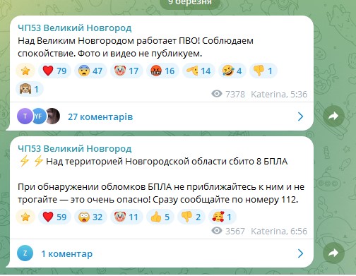 У ніч на 9 березня у Великому Новгороді пролунали вибухи. За попередніми даними, безпілотники могли атакувати завод ПАО "Акрон".