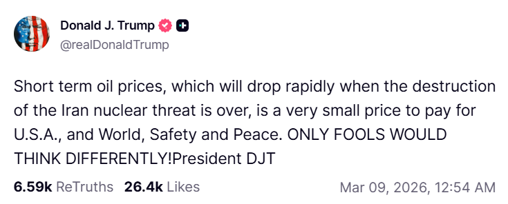 "Короткострокові ціни на нафту, які стрімко впадуть, коли зі знищенням іранської ядерної загрози буде покінчено, - це дуже невелика плата за Безпеку та Мир у США та в усьому світі. Тільки дурні можуть думати інакше!" - зазначив він.