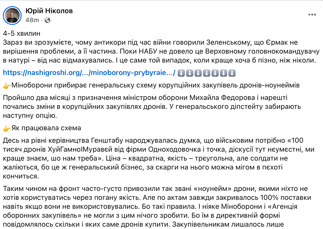 "І ніяке Міноборони і "Агенція оборонних закупівель" не могли з цим нічого зробити. Бо їм в директивній формі повідомлялось скільки і яких саме дронів купити. Закупівельникам лишалось лише звернутись до означеного Генштабом постачальника, дізнатись у нього його ціну, і оплатити чек