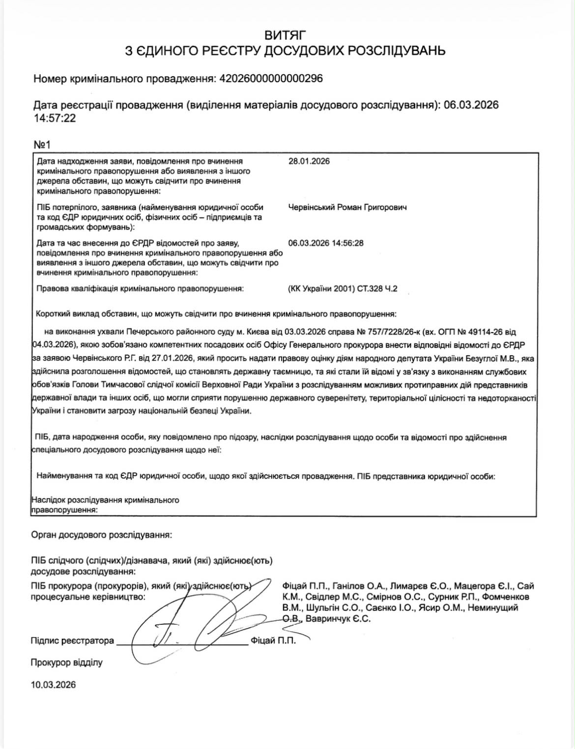Офіс Генерального прокурора України вніс дані до ЄРДР за заявою Романа Червінського щодо дій народної депутатки Марʼяни Безуглої.