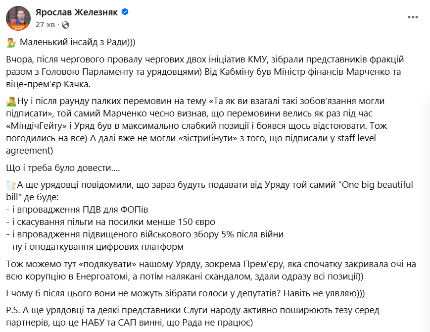 "Ну і після раунду палких перемовин на тему "Та як ви взагалі такі зобовʼязання могли підписати", той самий Марченко чесно визнав, що перемовини велись як раз під час "МіндічГейту" і Уряд був у максимально слабкій позиції і боявся щось відстоювати. Тож погодились на все) А далі вже не могли "зістрибнути" з того, що підписали у staff level agreement", - розповів Железняк.