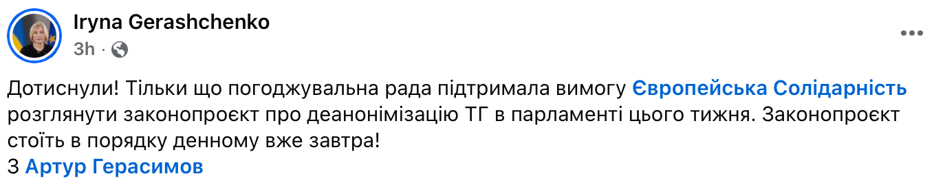 "Дотиснули! Тільки що погоджувальна рада підтримала вимогу "Європейської Солідарності" розглянути законопроєкт про деанонімізацію ТГ в парламенті цього тижня. Законопроєкт стоїть в порядку денному вже завтра!", - написала Геращенко.