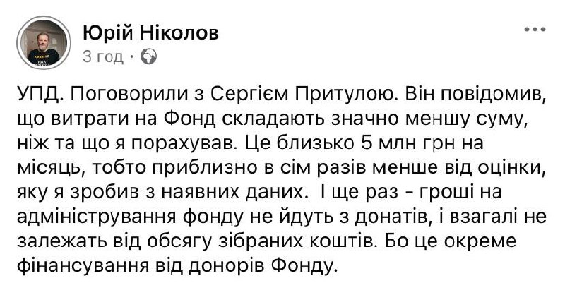 Після оприлюднення вищезгаданого допису Ніколов повідомив, що поговорив із Притулою. Волонтер розповів, що витрати на Фонд становлять близько 5 млн грн на місяць - це майже в сім разів менше за попередню оцінку журналіста.