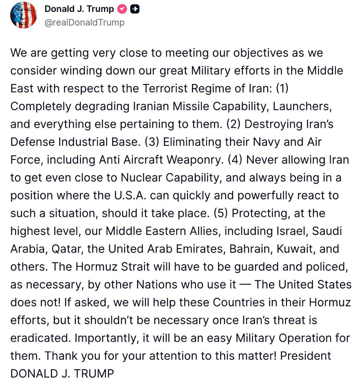"Ормузька протока має охоронятися і контролюватись, за необхідності, іншими країнами, які її використовують — Сполучені Штати цього не роблять! Якщо нас попросять, ми допоможемо цим країнам у їхніх зусиллях щодо забезпечення безпеки в Ормузькій протоці, але в цьому не буде необхідності, коли загроза з боку Ірану буде ліквідована", - заявив очільник США.