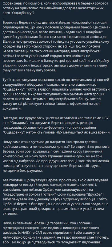 Глава МЗС Угорщини Петер Сійярто заявив, що ситуація із вилученням валюти та золота, які перевозили інкасатори "Ощадбанку", становить питання національної безпеки країни. У Будапешті також припускають можливий зв’язок цих коштів із втручанням в угорські вибори.