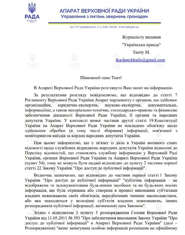 "Інформуємо, що у зв'язку із дією в Україні воєнного стану відомості щодо службових відряджень народних депутатів України віднесені до переліку відомостей, що становлять службову інформацію у Верховній Раді України, органах Верховної Ради України та апараті Верховної Ради України (пункт 54), тому не можуть бути надані відповідно до пункту 2 частини першої статті 22 Закону України "Про доступ до публічної інформації", - йдеться у відповіді апарату ВРУ.