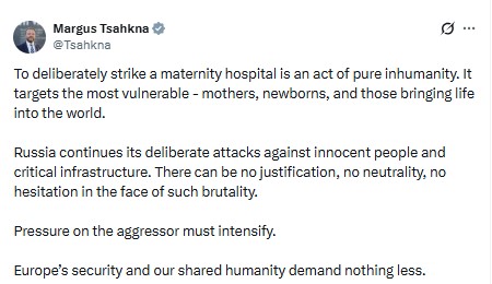 Міністр закордонних справ Естонії Маргус Цахкна прокоментував нічну атаку РФ по пологовому будинку в Одесі.