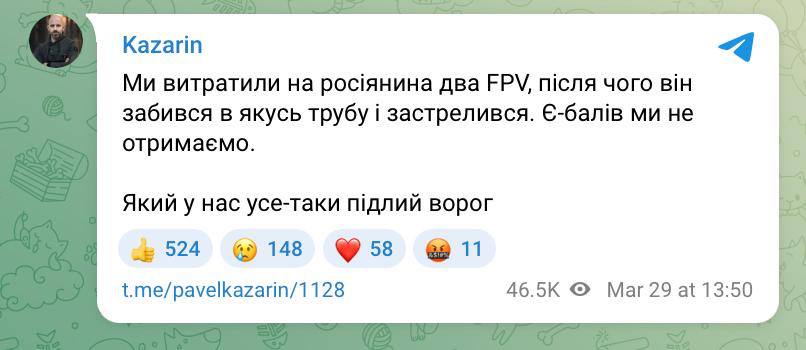 Про це в ефірі заявив командир взводу безпілотних систем бригади "Хартія" Юрій Бутусов, передає Цензор.НЕТ.