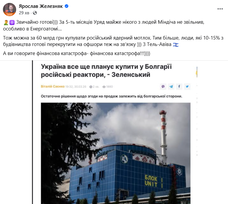 "Звичайно готові))) За 5-ть місяців Уряд майже нікого з людей Міндіча не звільнив, особливо в Енергоатомі… Тож можна за 60 млрд грн купувати російський ядерний мотлох. Тим більше, люди, які 10-15% з будівництва готові перекрутити на офшори теж на звʼязку ))) З Тель-Авіва", - зазначив Железняк.