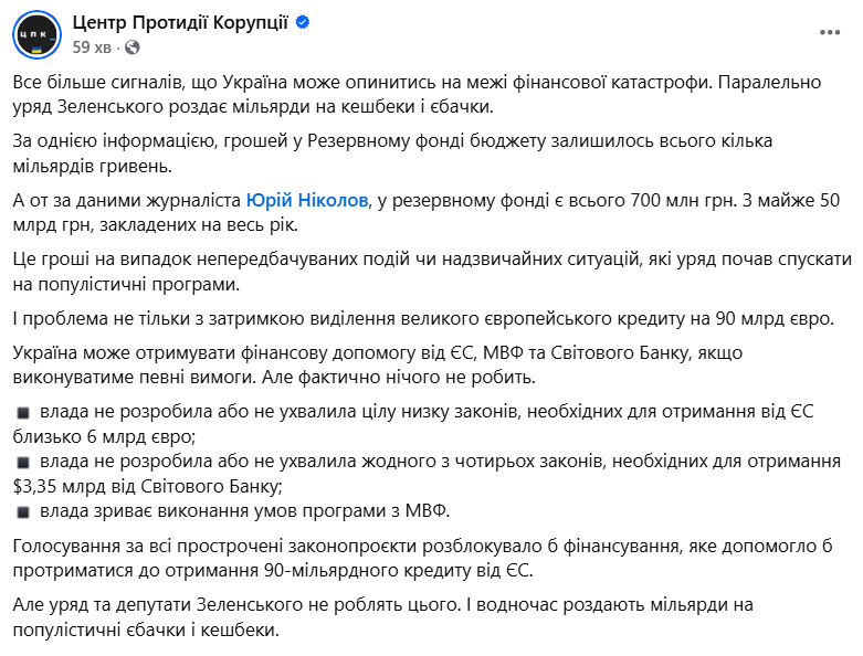 "Все більше сигналів, що Україна може опинитись на межі фінансової катастрофи. Паралельно уряд Зеленського роздає мільярди на кешбеки і єбачки. За однією інформацією, грошей у Резервному фонді бюджету залишилось всього кілька мільярдів гривень.