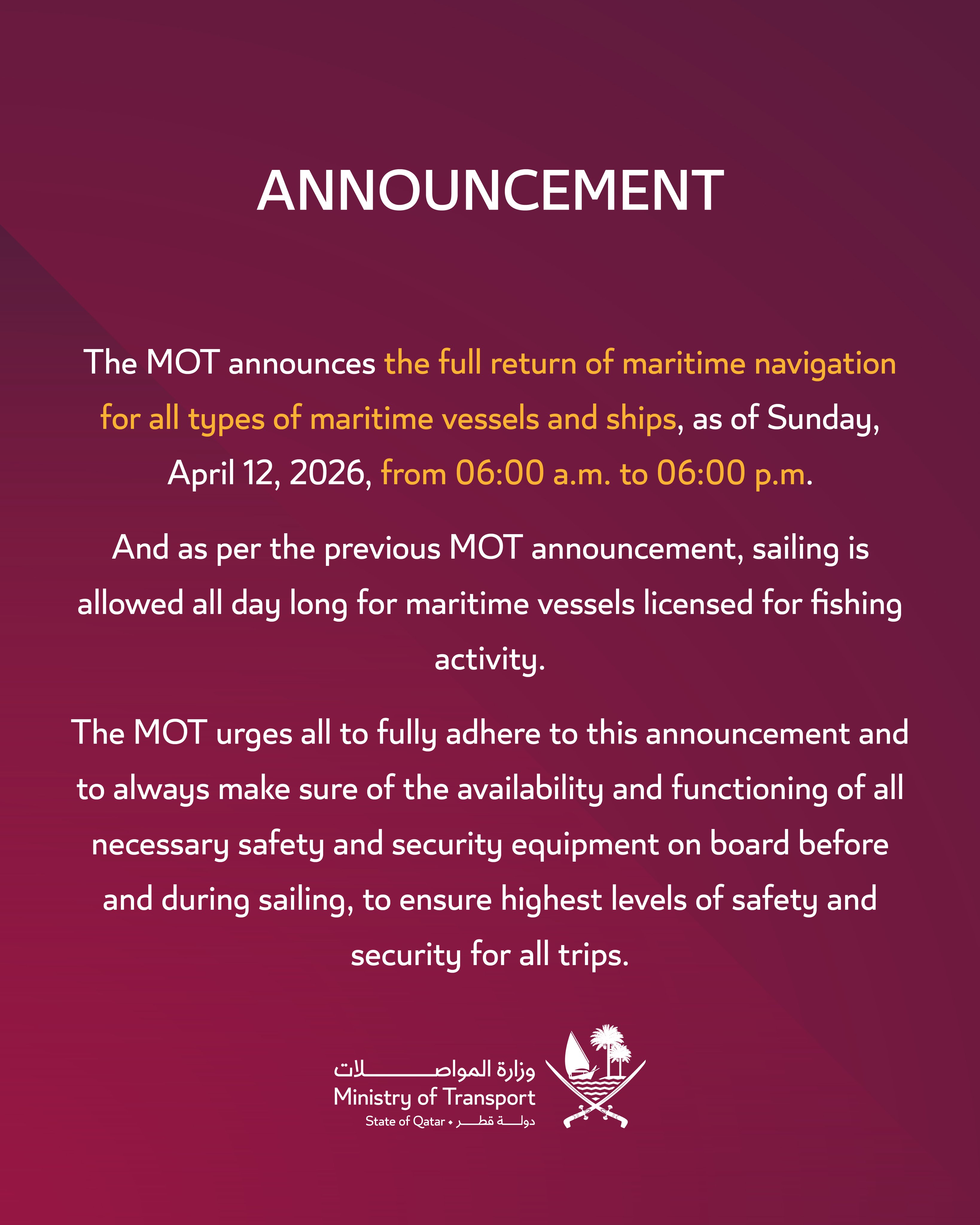 Із 12 квітня буде повністю відновлено рух для всіх морських суден у територіальних водах Катару.