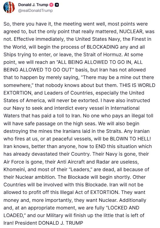 "Ніхто, хто сплачує незаконне мито, не матиме безпечного проходу у відкритому морі. Ми також почнемо знищувати міни, які іранці заклали у протоці. Ми також почнемо знищувати міни, які іранці заклали у протоках. Будь-який іранець, який стрілятиме по нас або по мирних суднах, відправиться до пекла! Іран краще за будь-кого знає, як покінчити з цією ситуацією, яка вже спустошила їхню країну", - написав американський лідер.