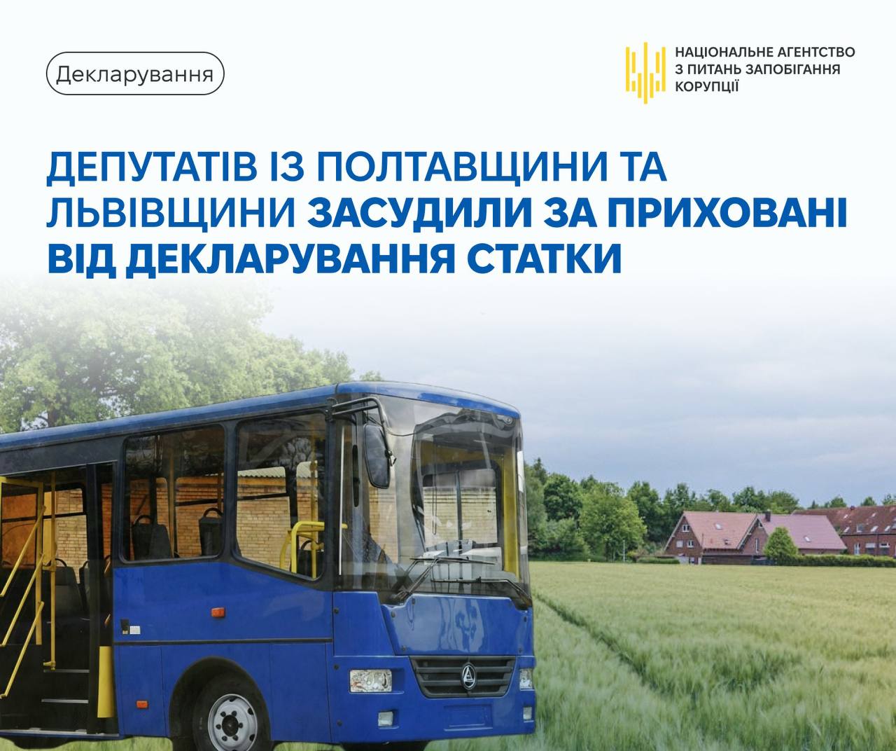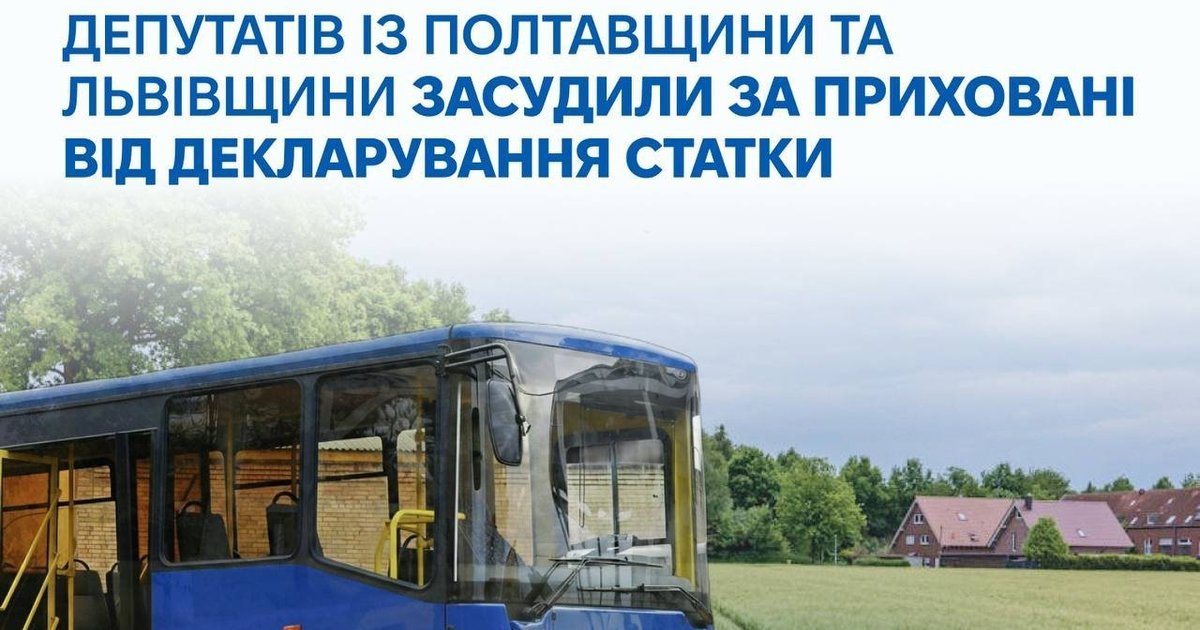 - Миколаївський районний суд Львівської області розглянув два протоколи стосовно депутата Розвадівської сільської ради. У деклараціях за 2023 та 2024 роки він "забув" вказати майно на суму понад 1 млн грн у кожній. Серед незадекларованого: 2 земельні ділянки, житловий будинок та два автобуси (БАЗ і SETRA).