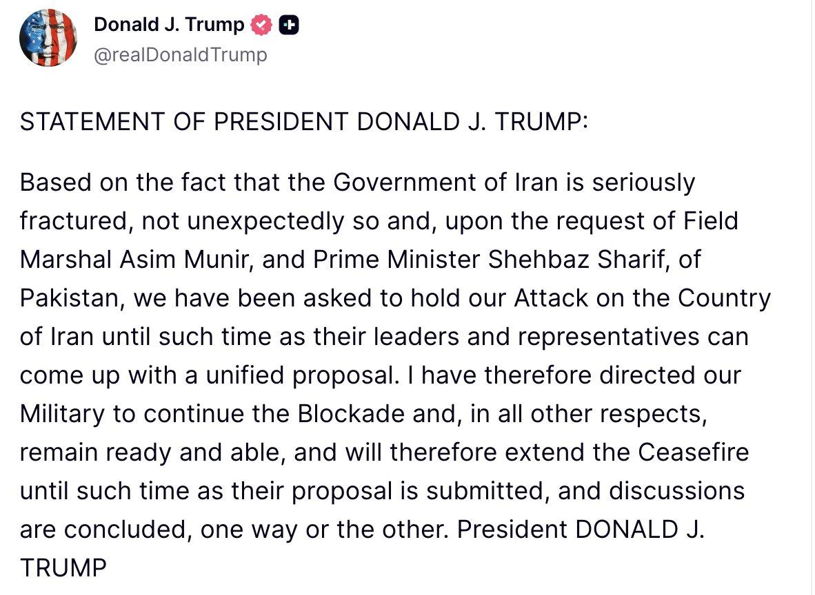 Американський президент пояснив, що продовження режиму припинення вогню має дати Ірану час для формування єдиної позиції на переговорах.