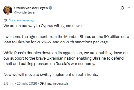 "Ми прямуємо на Кіпр з гарними новинами. Я вітаю угоду держав-членів щодо позики Україні в розмірі 90 мільярдів євро на 2026-27 роки та щодо 20-го пакету санкцій", - йдеться в повідомленні.