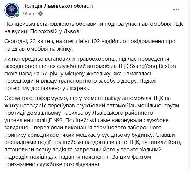 За попередніми даними слідства, під час перевірки документів службове авто ТЦК SsangYong Rexton наїхало на 57-річну місцеву жительку, яка хотіла перешкодити виїзду автівки з двору. Зараз вона у лікарні.