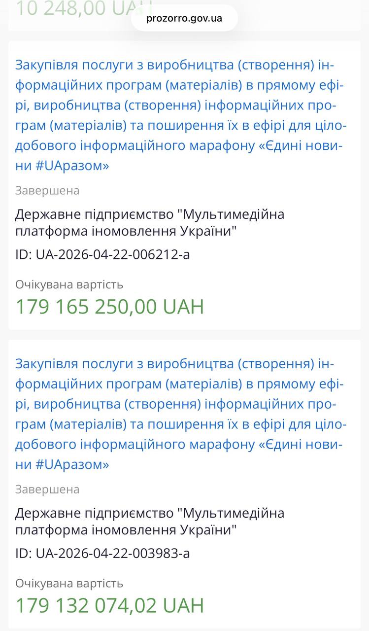 - 179 млн грн (із розрахунку 169 тис. грн за годину контенту без ПДВ) — "Ми-Україна",