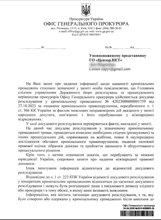 Водночас в Офісі генпрокурора не надали інші деталі, пославшись на таємницю досудового розслідування. Наголосили, що інформація, отримана в межах кримінального провадження, може бути розголошена лише з дозволу слідчого або прокурора і в обмеженому обсязі. Оприлюднення таких даних може зашкодити слідству, а також порушити права осіб, які фігурують у провадженні.