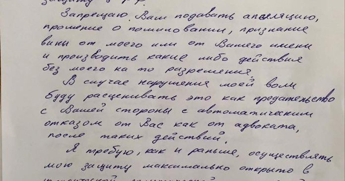 Фейгін оприлюднив заяву Савченко від 23 березня, у якій вона забороняє своїм захисникам подавати апеляцію на її вирок або прохання про помилування.