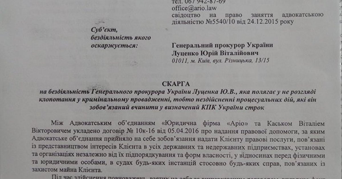 Зазначимо, адвокати екс-заступника Генпрокурора Каська просять визнати бездіяльність Луценка, який, як вони заявили, у зазначений триденний термін не розглянув клопотання адвокатів про скасування постанови першого заступника Генпрокурора Севрука щодо їхнього підзахисного (цією постановою Севрук продовжив термін розслідування кримінального провадження стосовно Каська).