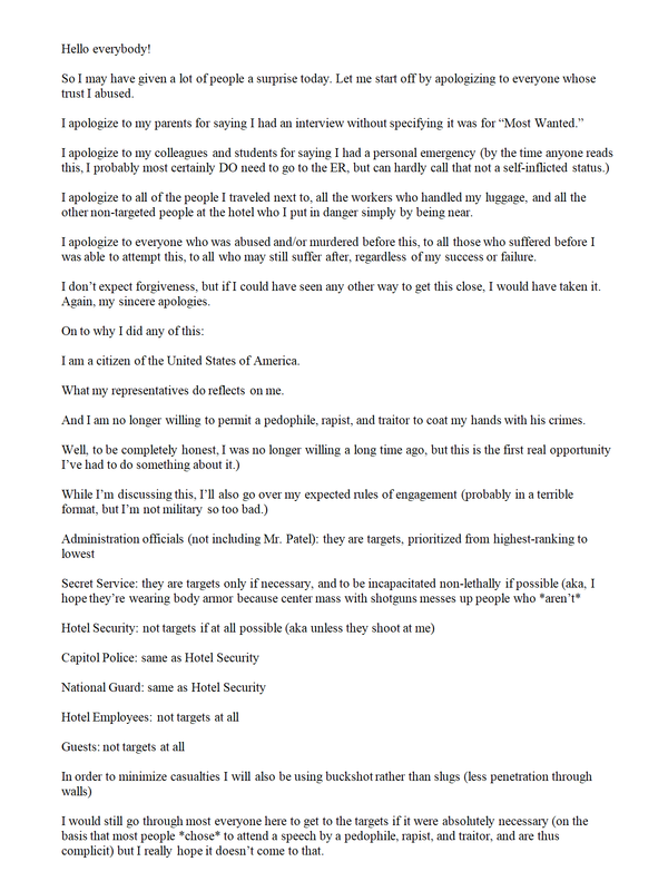 Я більше не готовий дозволяти педофілу, ґвалтівнику та зраднику бруднити мої руки своїми злочинами - маніфест стрільця Коула Аллена надісланий незадовго до нападу під час прийому за участю Дональда Трампа.