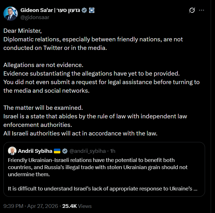 Глава МЗС Ізраїлю Гідеон Саар заявив, що "звинувачення не є доказами", коментуючи ситуацію з допуском суден із викраденим Росією українським зерном.