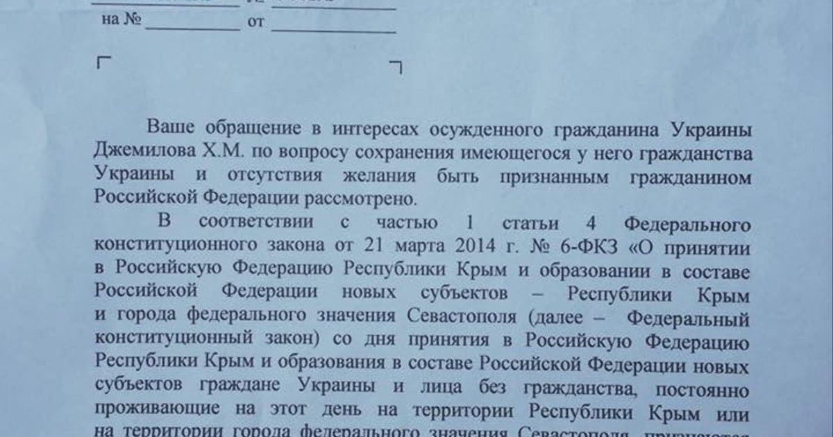 У документі від МВС на ім'я адвоката йдеться: "З огляду на, що Джемілєв Х.М. станом на 14 березня 2014 року на території Республіки Крим або на території Севастополя постійно не проживав, громадянином РФ, відповідно до ч.1 ст.4 Федерального конституційного закону він не визнаний, подання ним заяви про збереження чинного громадянства не потрібне".