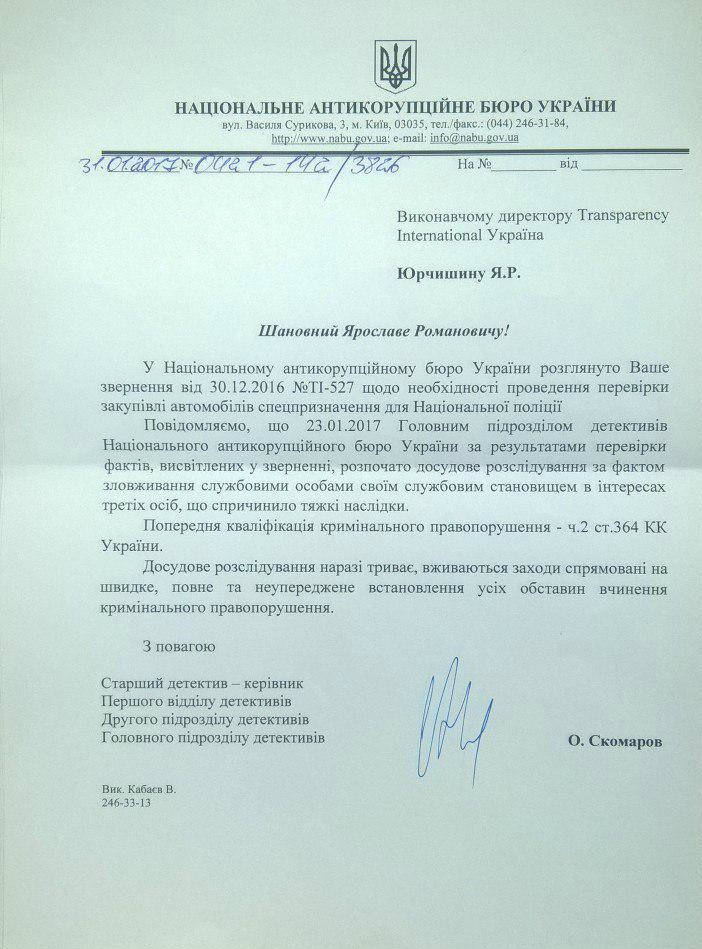 23 січня 2017 року детективи Національного антикорупційного бюро почали досудове розслідування за фактом закупівлі гібридних позашляховиків для потреб Національної поліції України.