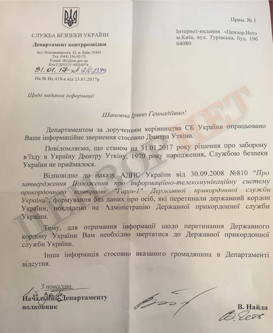 У документі йдеться: "Станом на 31.01.2017 року рішення про заборону в'їзду в Україну Дмитроу Уткіну, 1970 року народження, Службою безпеки України не приймалося".