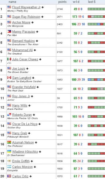 Флойд Мейвезер, Рэй Робинсон, Арчи Мур, Мэнни Пакьяо, Бернард Хопкинс, Мухаммед Али, ****** Сезар Чавес, Джо Луис, Сэм Лэнгфорд, Эвандер Холифилд,