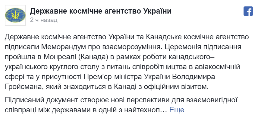 Україна і Канада підписали меморандум про співпрацю в освоєнні космосу