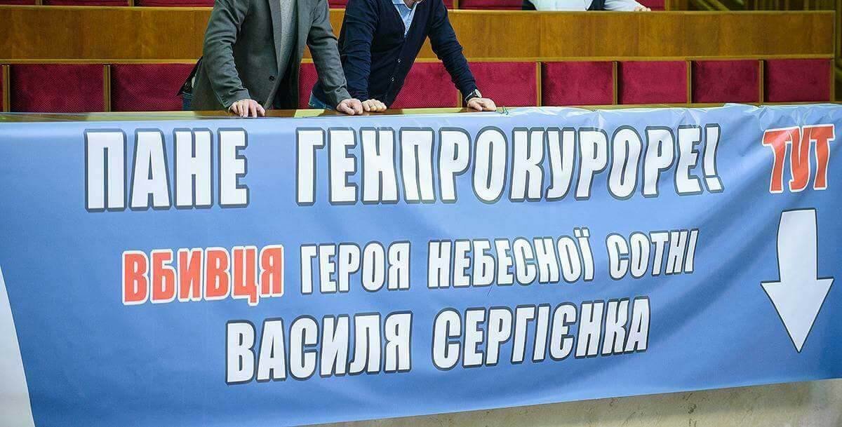 Він також повідомив, що вранці в сесійній залі вивісили плакат із закликом до Генпрокурора Юрія Луценка звернути увагу на Геннадія Бобова, підозрюваного в причетності до вбивства Сергієнка.