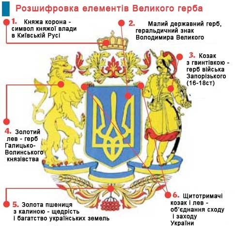 Тризуб, естественно, и есть Русь. Но Русь Владимира. Да и не все об этом знают. Большинство считает что тризуб это чёта там бИндеровское, в лучшем случае времён Сичи. Посему на Большом Гербе - стоило бы куда заметнее и конкретнее отобразить именно период Руси. Период могущества и огромной значимости на континенте, нашего государства.
