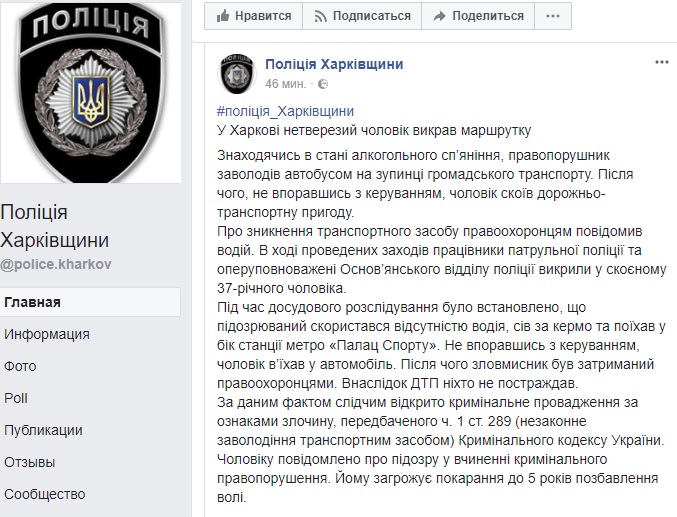У Харкові чоловік у стані алкогольного сп'яніння, скориставшись відсутністю водія в маршрутному мікроавтобусі, викрав його, після чого скоїв ДТП.