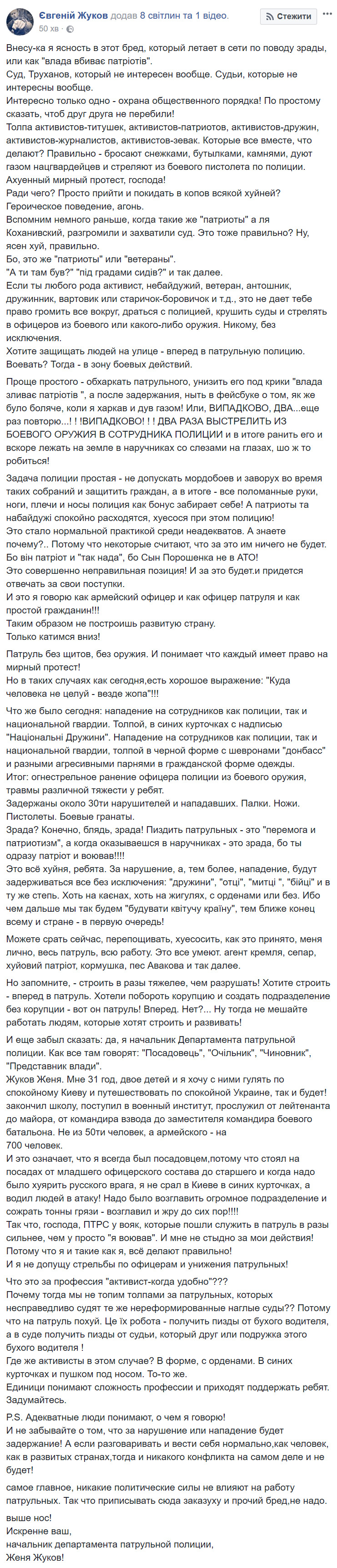 "Можете срать сейчас, перепощивать, х#есосить, как это принято, меня лично, весь патруль, всю работу. Это все умеют. агент кремля, сепар, х#йовий патріот, кормушка, пес Авакова и так далее. Но запомните, - строить в разы тяжелее, чем разрушать! Хотите строить - вперед в патруль. Хотели побороть корупцию и создать подразделение без корупции - вот он патруль! Вперед. Нет?... Ну тогда не мешайте работать людям, которые хотят строить и развивать! И еще забыл сказать: да, я начальник Департамента патрульной полиции. Как все там говорят: "Посадовець", "Очільник", "Чиновник", "Представник влади". Жуков Женя. Мне 31 год, двое детей и я хочу с ними гулять по спокойному Киеву и путешествовать по спокойной Украине, так и будет! Pакончил школу, поступил в военный институт, прослужил от лейтенанта до майора, от командира взвода до заместителя командира боевого батальона. Не из 50ти человек, а армейского - на 700 человек. И это означает, что я всегда был посадовцем,потому что стоял на посадах от младшего офицерского состава до старшего и когда надо было х#ярить русского врага, я не срал в Киеве в синих курточках, а водил людей в атаку! Надо было возглавить огромное подразделение и сожрать тонны грязи - возглавил и жру до сих пор!!!! Так что, господа, ПТРС у вояк, которые пошли служить в патруль в разы сильнее, чем у просто "я воював". И мне не стыдно за мои действия! Потому что я и такие как я, всё делают правильно! И я не допущу стрельбы по офицерам и унижения патрульных!" - заявив Начальник департаменту Патрульної поліції.